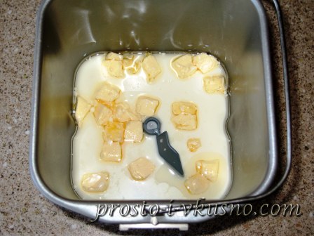 Накладываем ингредиенты в хлебопечку в том порядке, как указано в инструкции. В хлебопечку автора инструкции сначала закладываются жидкие продукты, поэтому сначала наливаеися молоко, растительное масло и кладется размягченный сливочный маргарин, порезанный на кусочки. Маргарин должен быть совсем мягкий. Внимание, в нашу хлебопечку закладывается в другом порядке - сначала сухое, потом жидкое, см. инструкцию к хлебопечке!!!